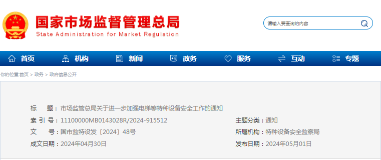 市场监管总局关于进一步加强电梯等特种设备安全工作的通知 各省、自治区、直辖市和新疆生产建设兵团市场监管局(厅、委): 近期,福建省厦门市发生“纸片人”维保电梯事件,上海市发生自动人行道伤人事故,深圳市公布欢乐谷“10·27”过山车碰撞事故调查报告,引起社会广泛关注。为强化隐患排查治理,有效遏制电梯等特种设备事故发生,保障人民群众生命财产安全,现就有关事项通知如下。一、全力保障电梯安全可靠运